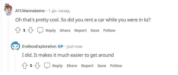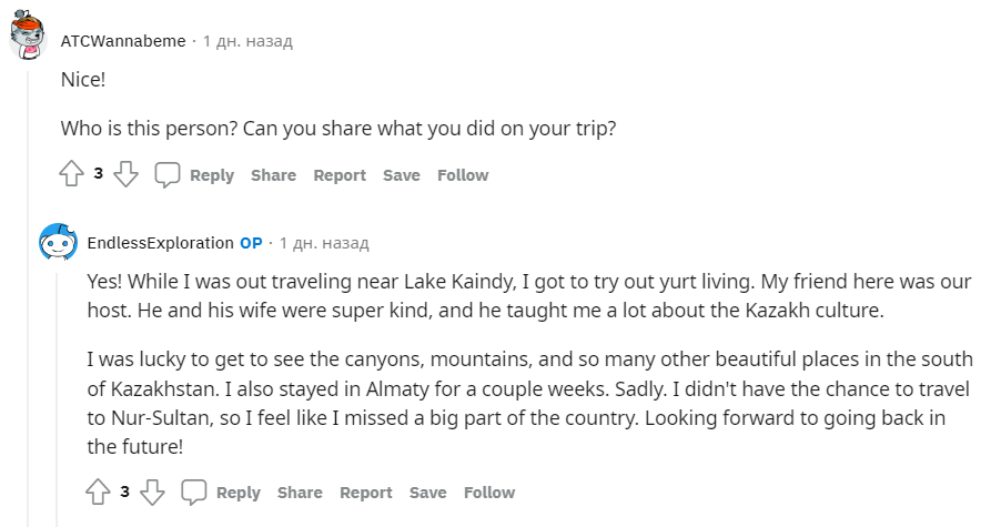 Мне посчастливилось увидеть каньоны, горы и много других красивых мест на юге Казахстана. Я также остался в Алматы на пару недель. Грустно. У меня не было возможности поехать в Нур-Султан, поэтому я чувствую, что пропустил большую часть страны. С нетерпением жду возвращения в будущем!", — поделился в комментариях под постом на сайте Reddit мужчина.