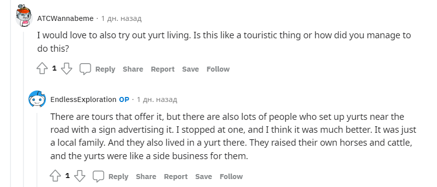 "Есть туры, которые предлагают это, но есть также много людей, которые устанавливают юрты возле дороги с табличкой, рекламирующей такой отдых. Я остановился у одной из них, и я думаю, что это было лучшее решение. Это была просто местная семья. Они тоже жили там в юрте. Они разводили своих лошадей и крупный рогатый скот, а юрты были для них как бы подсобным делом", — ответил американец на вопрос.