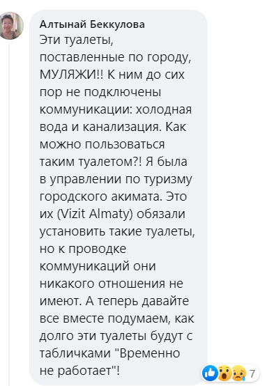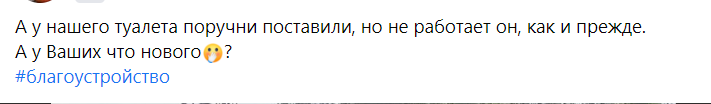 "А у нашего туалета поручни поставили, но не работает он, как и прежде. А у Ваших что нового?" — написала жительница Алматы Римма Корнилова в городскои паблике.
