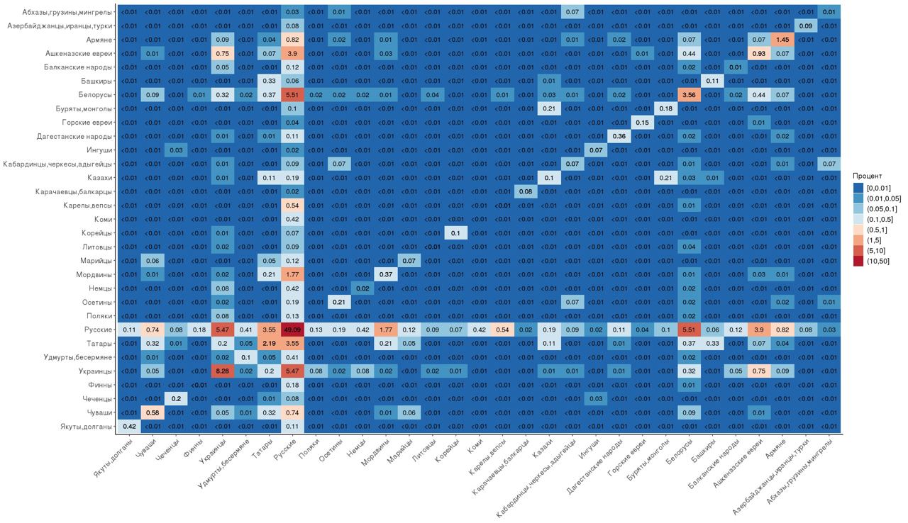 Специалисты Genotek подготовили интерактивную карту с тридцатью самыми распространенными этносами, проживающими на территории России. Изучив ее, можно проследить, насколько часто те или иные этносы создают пары с другими этносами: чем светлее квадрат пересечения, тем чаще встречаются такие союзы.