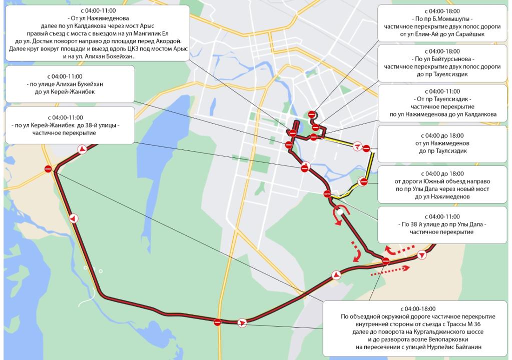 с 04:00-11:00 — от ул. Нажимеденова далее по ул. Калдаякова через мост «Арыс» правый съезд с моста с выездом на ул. Мангилик Ел до ул. Достык поворот направо до площади перед Акордой.