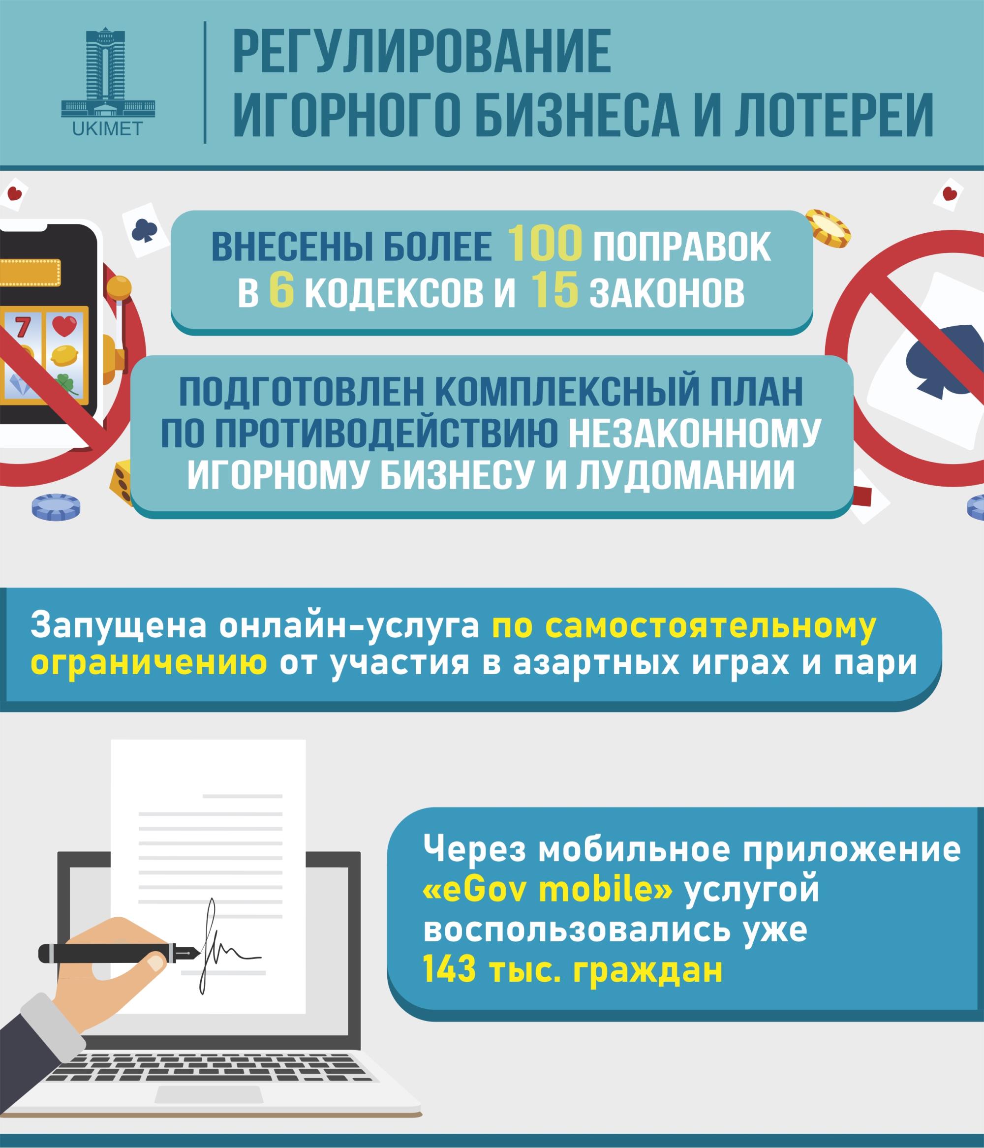 18 марта 2024 года в пилотном режиме запущена онлайн-услуга по самостоятельному ограничению граждан и резидентов Казахстана от участия в азартных играх и пари. Подать письменное ограничение можно через мобильное приложение «eGov mobile» и в бумажной форме.