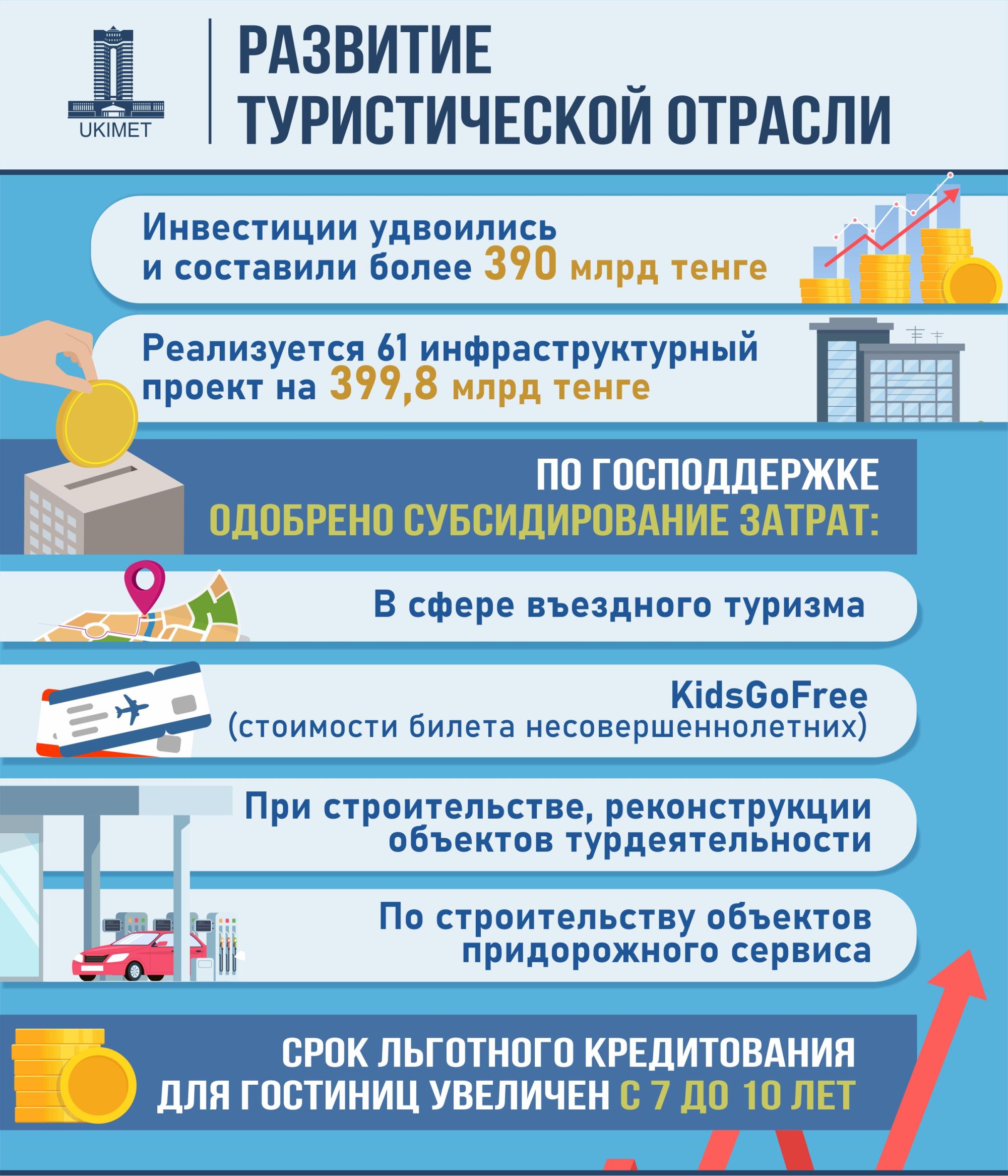 Для стимулирования предпринимательской активности в текущем году увеличен срок льготного кредитования для гостиничной сферы с 7 до 10 лет. По данному механизму планируется строительство гостиниц с международной франшизой в шести регионах. В городах Актобе и Павлодаре уже начата их реализация.
