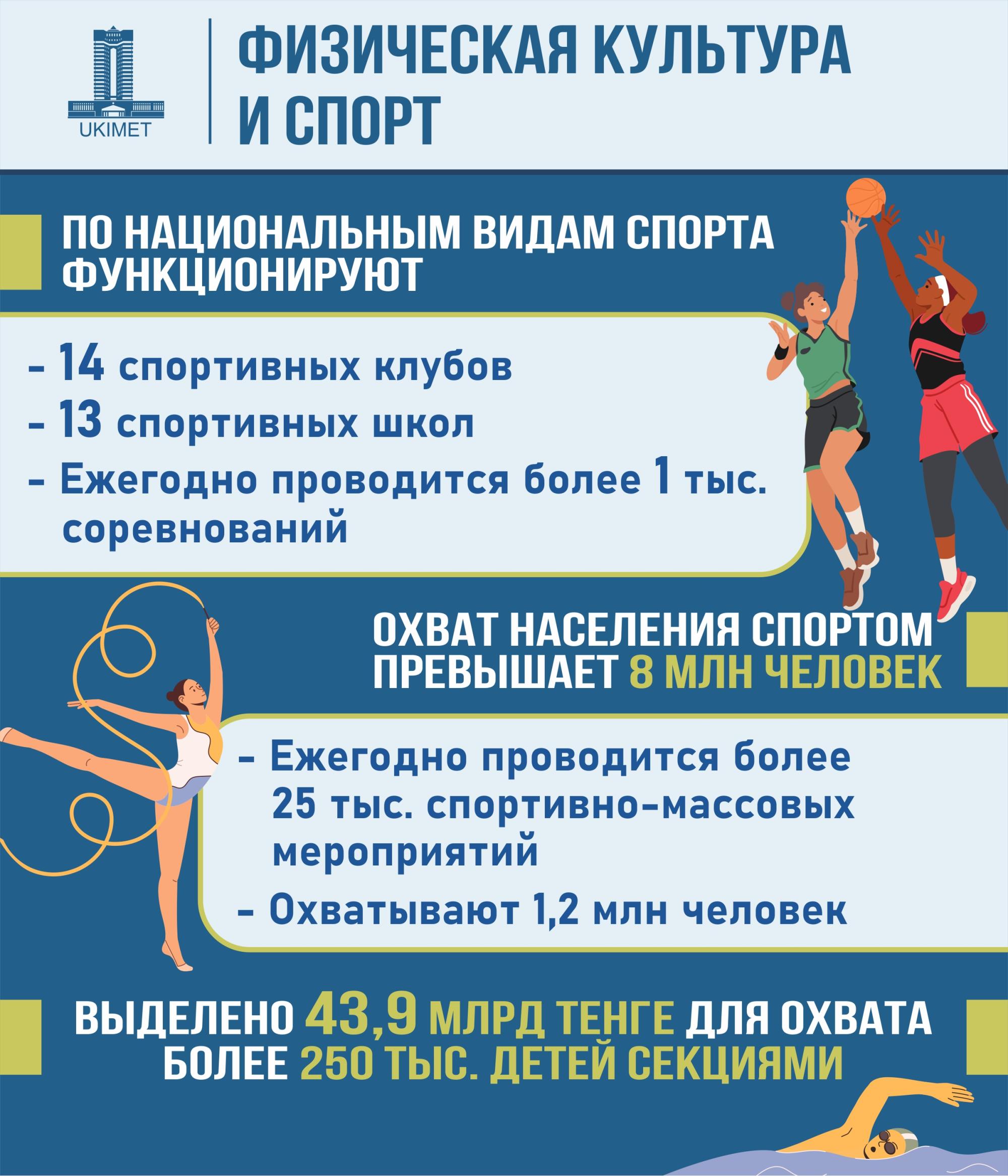 По итогам первого полугодия 2024 года охват населения занятиями физической культурой и спортом превышает 8 млн человек. Ежегодно в республике проводится более 25 тыс. спортивно-массовых мероприятий различного уровня, охватывающих 1,2 млн человек.