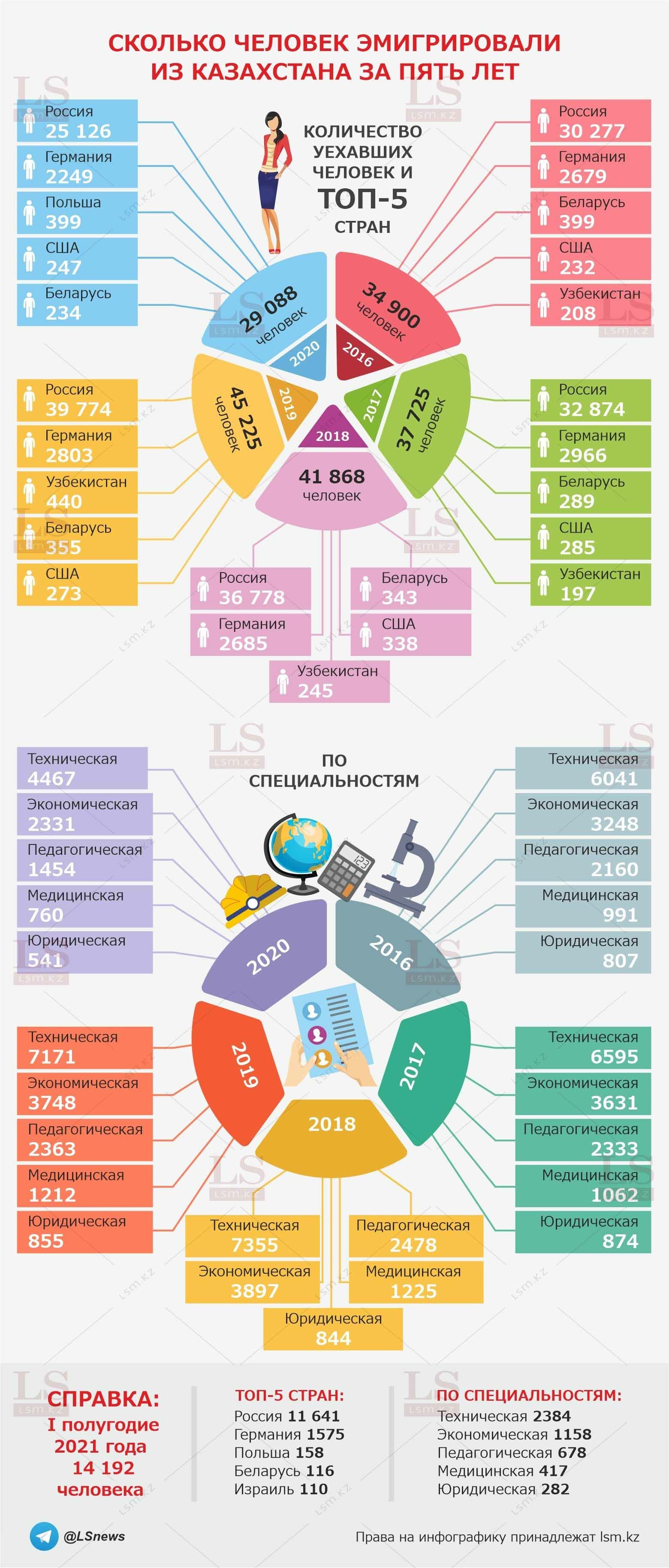 В инфографике представлена более подробная информация об эмиграции из Казахстана с 2016 по 2020 год, а также за первое полугодие 2021-го.