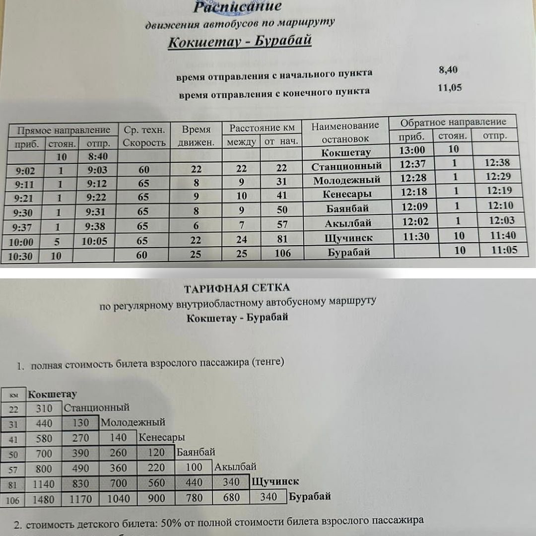 По информации акимата Бурабайского района, зимой автобусы будут ходить четыре дня в неделю — по понедельникам, пятницам, субботам и воскресеньям. Летом — ежедневно.