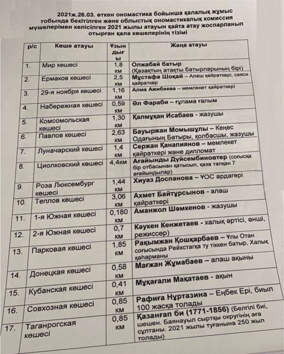 Напомним, что ранее руководитель управления культуры, развития языков и архивного дела Павлодарской области Самал Бегалинова подтвердила актуальность попавшего в социальные сети списка подлежащих переименованию 30 улиц, но пока этот список носит неокончательный характер и может быть изменен.