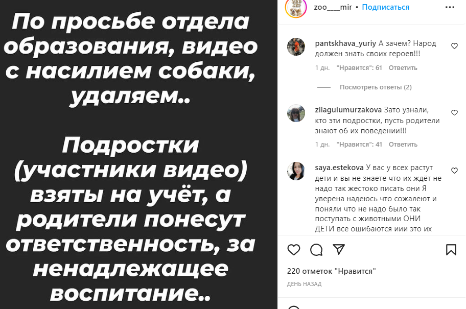 На видео школьники из Аксая (ЗКО) бросают собаку через плечо, удерживают её за лапы, придавливают собой, изображая сношение с животным. Видео опубликовали на выходных, но из первоисточника уже удалили по просьбе из отдела образования:
