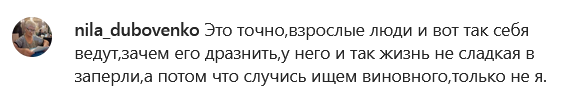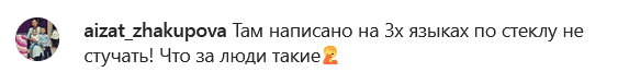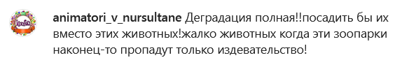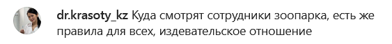 Комментаторов поведение посетитетелй зоопарка ужаснуло. Они написали, что подобное поведение не только неприемлемо, но и прямо запрещено — табличка, сообщающая об этом на казахском, русском и английском языках, висит на вольере. Также их расстроило, что взрослые прививают подобную манеру обращения с животными детям. Отдельное внимание обратили на отсутствие сотрудников зоопарка, которые должны пресекать подобное поведение.