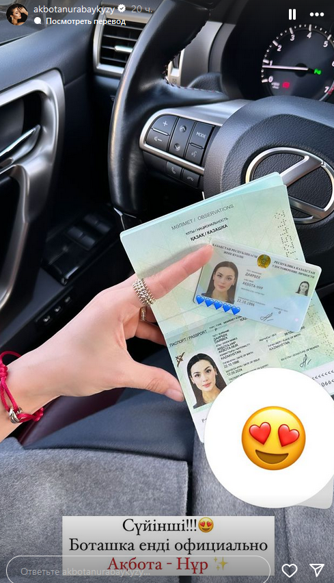 «Суюнши! Боташка теперь Акбота-Нур», — написала артистка, показав фото паспорта и удостоверения с новым именем.