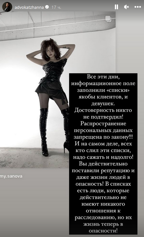 "Все эти дни информационное поле заполнили "списки" якобы клиентов и девушек. Достоверность никто не подтвердил! Распространение персональных данных запрещено по закону!