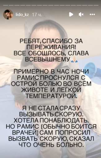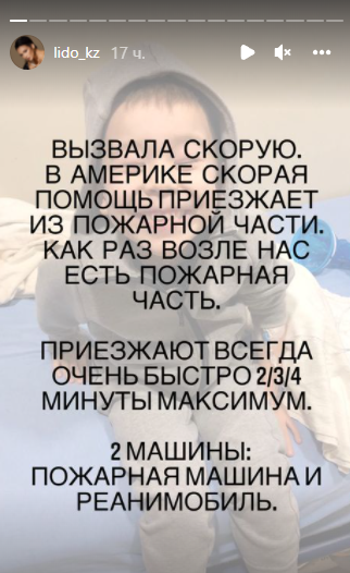 Лидо Досалина рассказала, как ночью к ней приехали экстренные службы: "Примерно в час ночи Рамис проснулся с острой болью во всем животе и легкой температурой. Я не стала сразу вызывать скорую, хотела понаблюдать (Рамис обычно боится врачей) — сам попросил вызвать скорую, сказал, что очень больно. Вызвала скорую. В Америке скорая помощь приезжает из пожарной части. Как раз возле нас есть пожарная часть. Приезжают всегда очень быстро, 2-4 минуты максимум. Две машины, пожарная машина и реанимобиль".