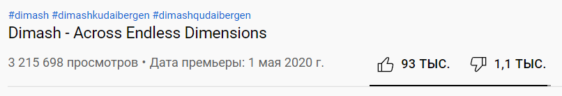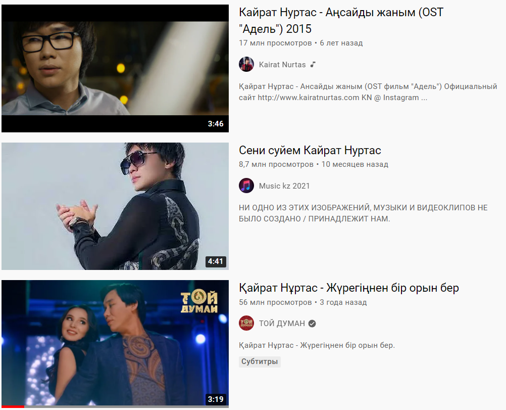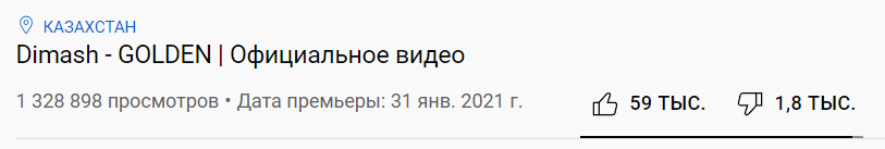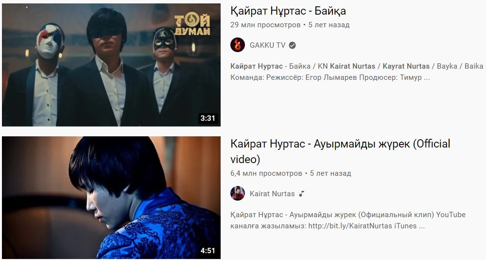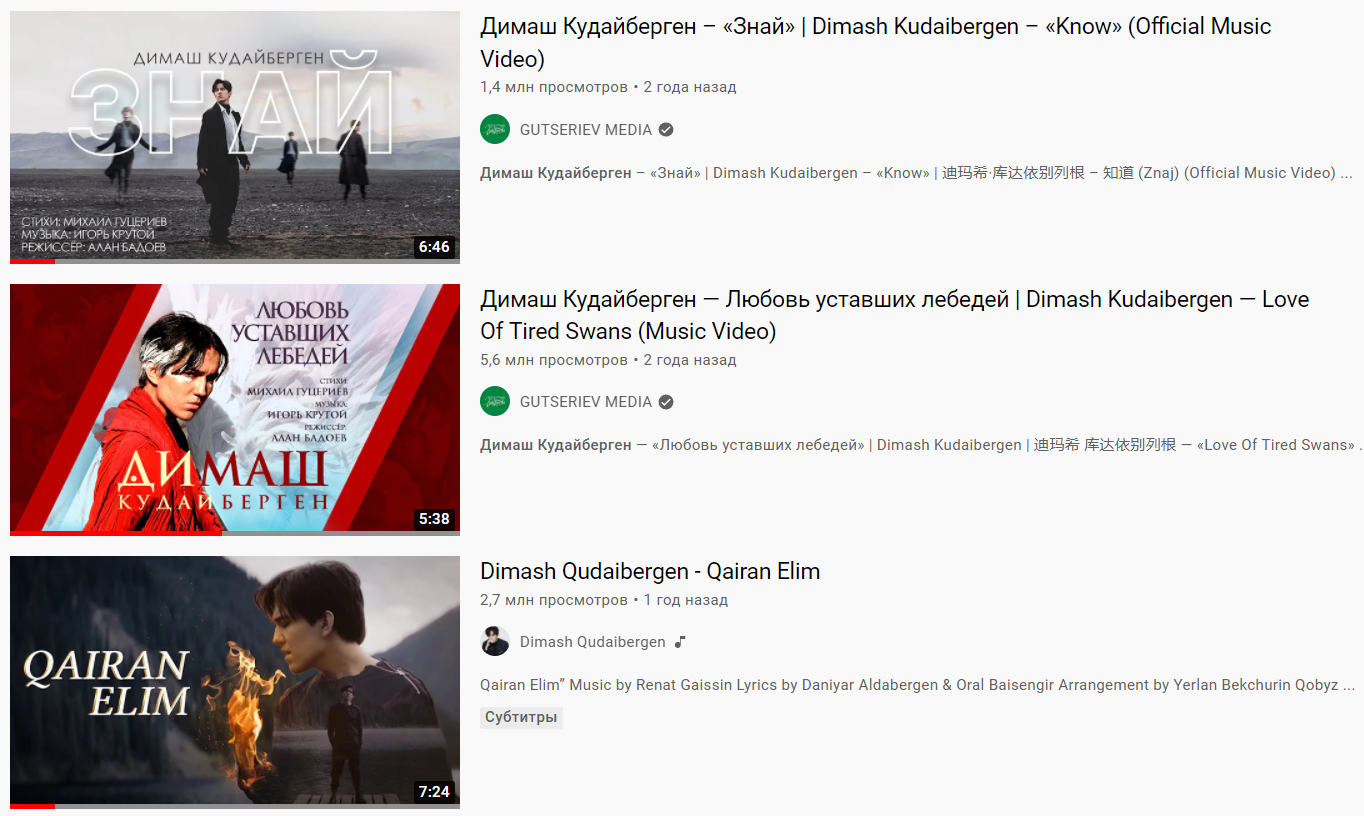 Остальные находятся в диапазоне от трех до одного миллиона просмотров. Цифры, безусловно, немаленькие, но и не самые крупные для казахстанских исполнителей.