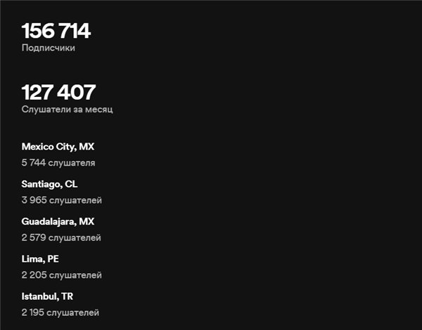Также можно привести статистику российского сервиса Яндекс.Музыка, где тоже размещаются песни Димаша Кудайбергена. По данным сервиса, всего страница исполнителя собрала 19 725 лайков. За октябрь статистика прослушиваний составила 39 200 слушателей. Пиковый результат пришелся на сентябрь — 40 730 слушателей.