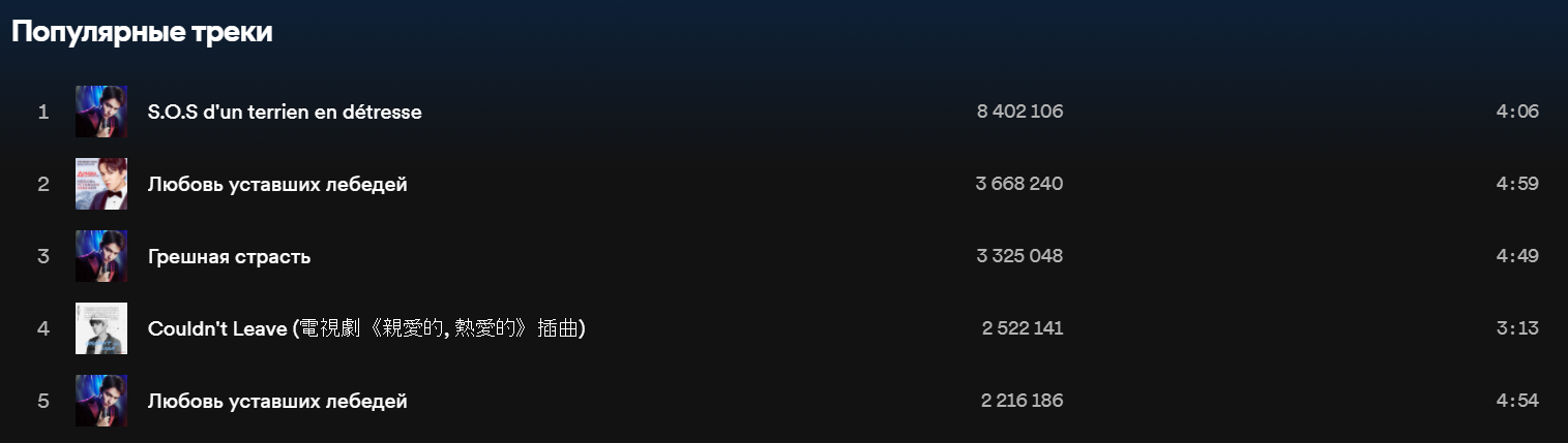 А одна из последних композиций — 10 857. Тут важно учитывать, что Shazam и прочие сервисы обрабатывают только официальные аудиодорожки, которые были опубликованы на других музыкальных площадках, поэтому мы не рассматриваем кавер-версии исполнителя, такие как SOS d'un terrien en detresse, сделавшие его известным на весь мир.