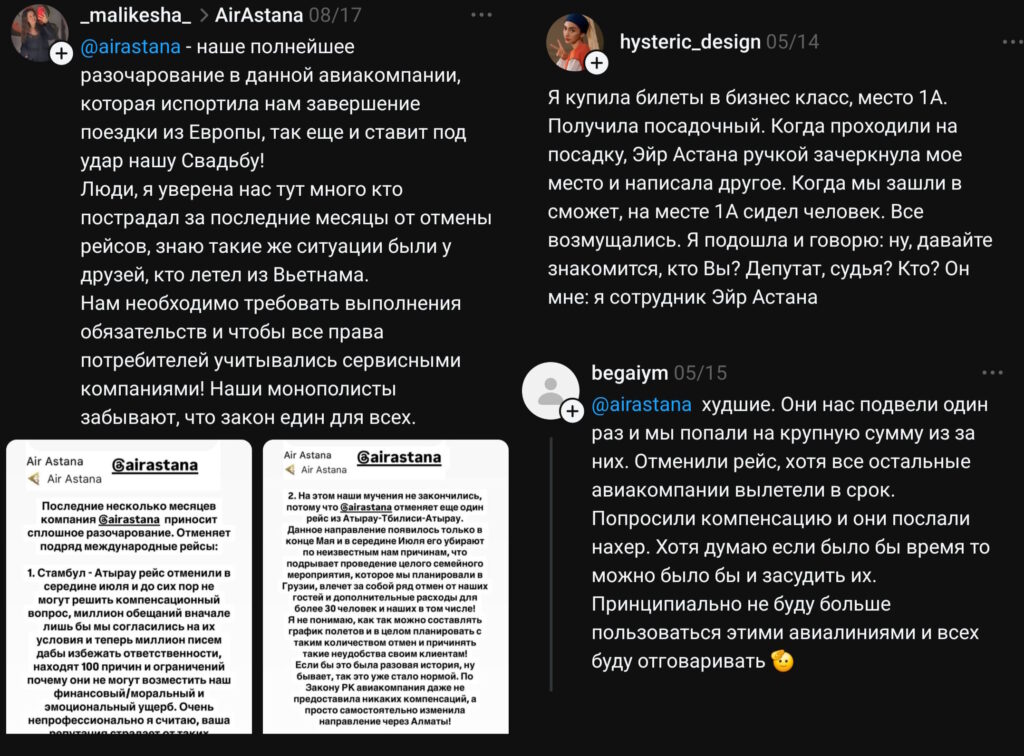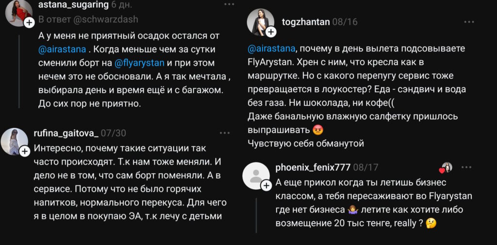 В итоге пассажиров, которые заплатили за сервис Air Astana, пересадили на борт Fly Arystan со всеми вытекающими последствиями. Судя по жалобам в соцсетях, это далеко не первый такой случай. При этом пассажиры бизнес-класса лишаются преимуществ, которые должны быть гарантированы доплатой за более дорогой билет, так как в самолетах FlyArystan нет соответствующего салона.