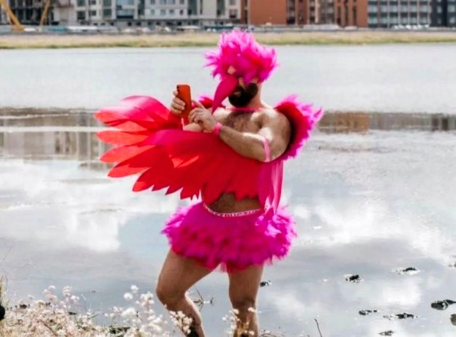 В 2021 году блогер и любитель эпатажа Юрий Толочко устроил перфоманс на одном из озёр Казахстана. Он надел костюм розового фламинго и вышел в таком виде на озеро. По словам Толочко, так он решил выступить в защиту водоёма. Правда, этот костюм фламинго был бы более уместен на сцене гей-клуба или на шоу трансвеститов. Короткая розовая юбочка из перьев, голый волосатый торс, лысина и маска с клювом, из-под которой торчит окладистая борода.