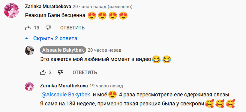 На видео смеющаяся Айсауле вручает Баян коробку, та с подозрением комментирует потенциальный сюрприз, а потом достает листок бумаги, на котором написано "Ты скоро станешь апашкой". Баян уточняет у Айсауле, о ее ли беременности речь, радуется, обнимает и целует дочь. Далее Айсауле поясняет, что они сразу начали снимать, поэтому Баян Алагузова заподозрила, что ее хотят разыграть, положив в коробочку насекомое, и сначала отнеслась к подарку с недоверием.