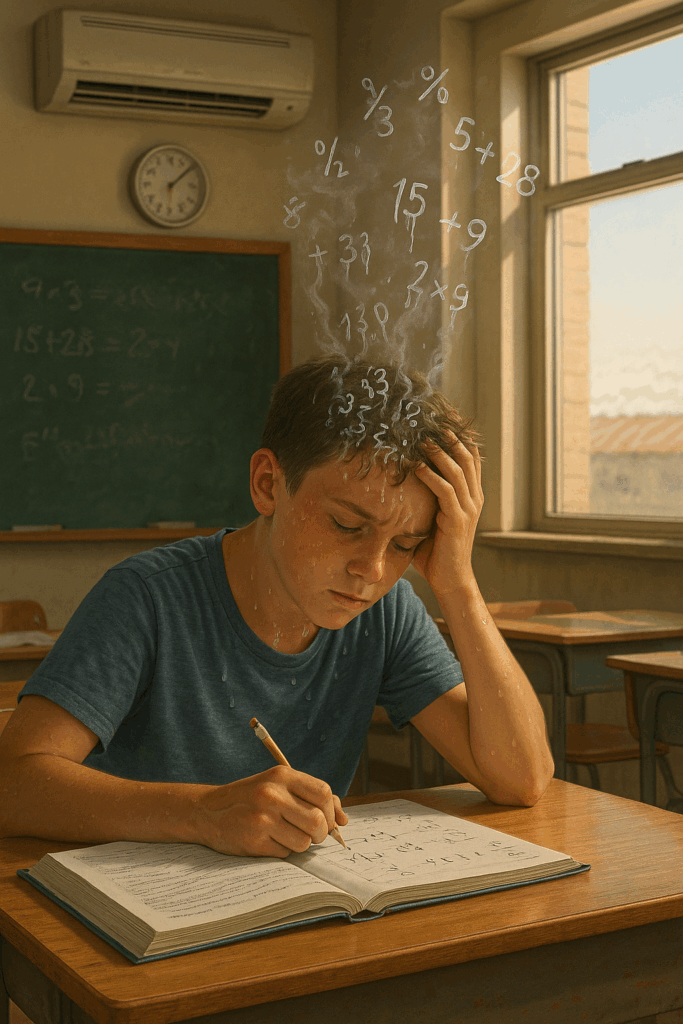 Это не шутка. Доклад указывает на прямую связь между жарой и снижением уровня знаний. Чем выше среднегодовая температура в стране, тем хуже школьники справляются с тестами по математике.