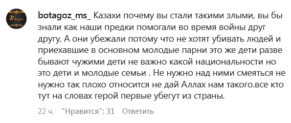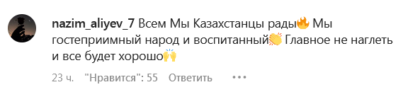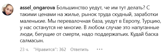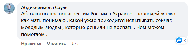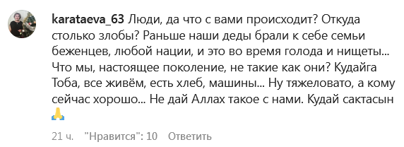 Многие пользователи согласны с ним, считая, что, как в случае со странами, принявшими беженцев из Украины, происходящее положительно скажется на Казахстане. Кроме того, они апеллируют как к общечеловеческим ценностям, так и к традиционному для казахов гостеприимству. Это можно увидеть и в комментариях по всем социальным сетям.