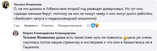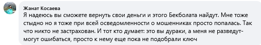 Анастасия пишет, что после этого начались отговорки. Бекболат обещал вернуть деньги завтра, объяснял задержку тем, что сотрудница украла деньги и он подал заявление в полицию. Потом мужчина предложил подъехать приехать по адресу в селе Коккайнар. Анастасия отмечает, что никакого озера рядом с указанным Бекболатом местом не было, «обычный частный сектор». Ни домика у озера, ни Бекболата там не оказалось.