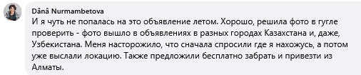 «Связалась с владельцем. Мужчина по имени Бекболат: вежливый, уверенный, прислал удостоверение личности, говорил спокойно, обещал уют и комфорт», — пишет обманутая алматинка дальше.