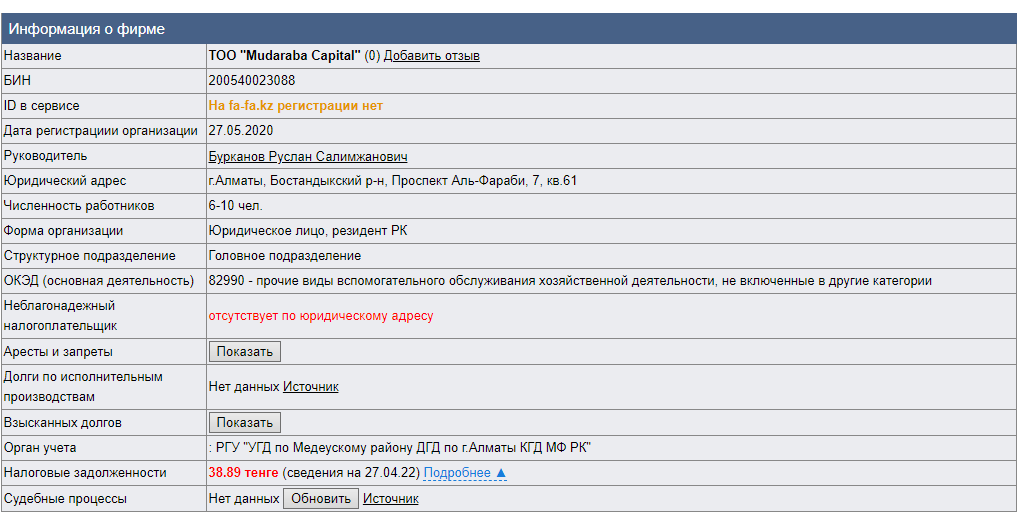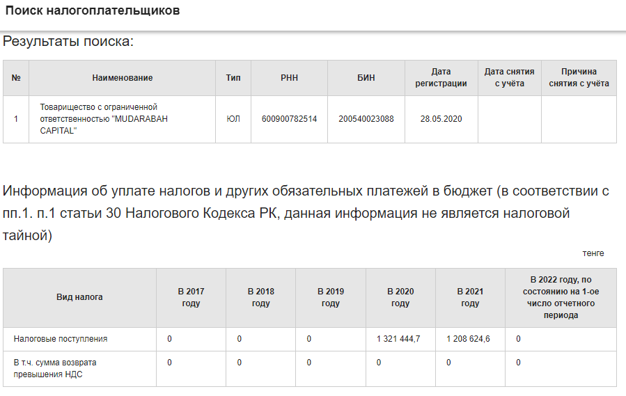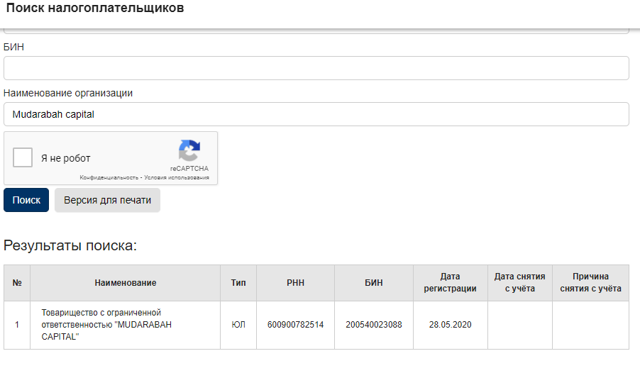Третья причина для беспокойства — компания не хочет предоставлять вам свои реквизиты и лицензию от АРРФР (Агентство Республики Казахстан по регулированию и развитию финансового рынка), скрывает информацию о сделках и источниках дохода, называет это секретом фирмы, который не хочет пока раскрывать. Впрочем, узнать БИН компании, чтобы потом проверить её в открытых источниках в Интернете, можно на сайте КГД. Вот как это выглядит на примере "Mudarabah capital":