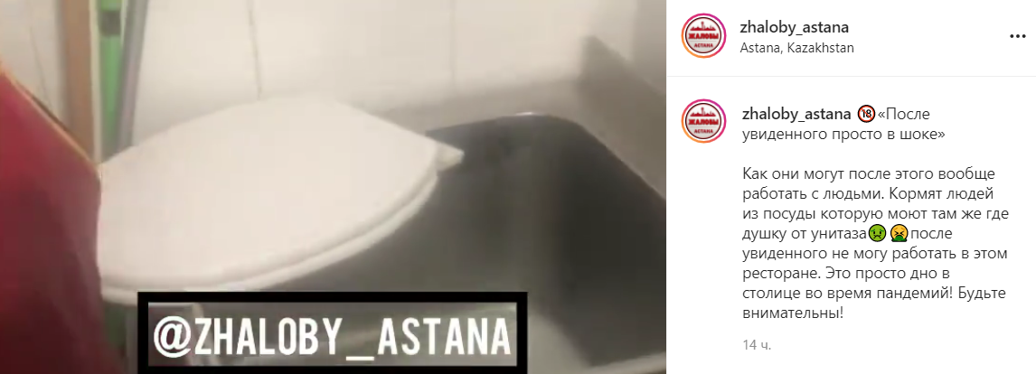 "Как они могут после этого вообще работать с людьми? Кормят людей из посуды, которую моют там же, где душку от унитаза. После увиденного не могу работать в этом ресторане. Это просто дно в столице во время пандемии! Будьте внимательны!" — говорится в опубликованной жалобе.