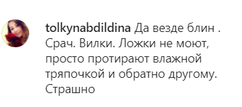 "Везде так. Вилки, ложки не моют, просто протирают влажной тряпочкой и обратно другому. Страшно", "Необходимо во всех местах, где готовят, в обязательном порядке установить видеонаблюдение", "Не ем в ресторанах, даже если пригласят. Наработалась, насмотрелась, ответственных единицы", — пишут участника паблика в комментариях.