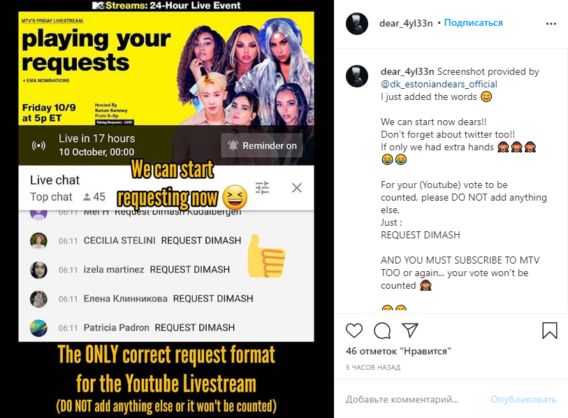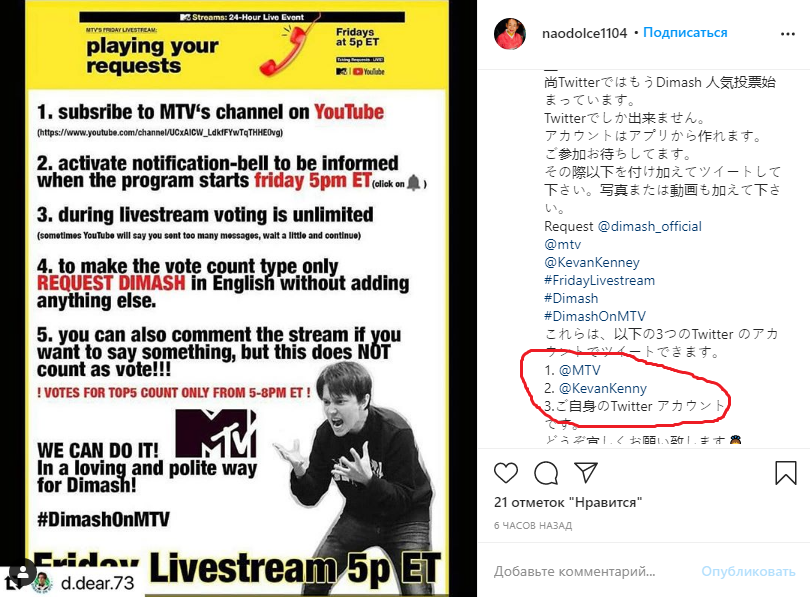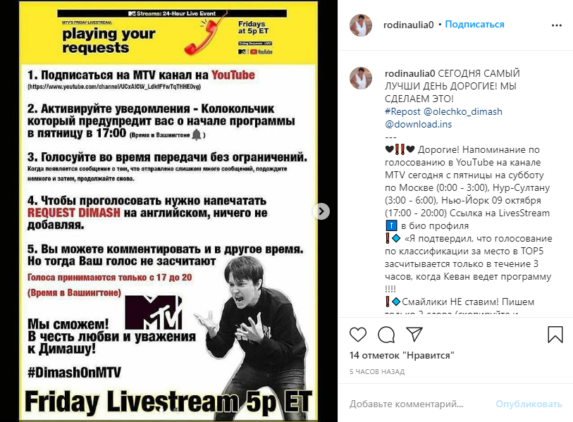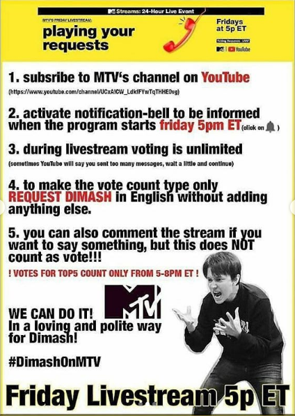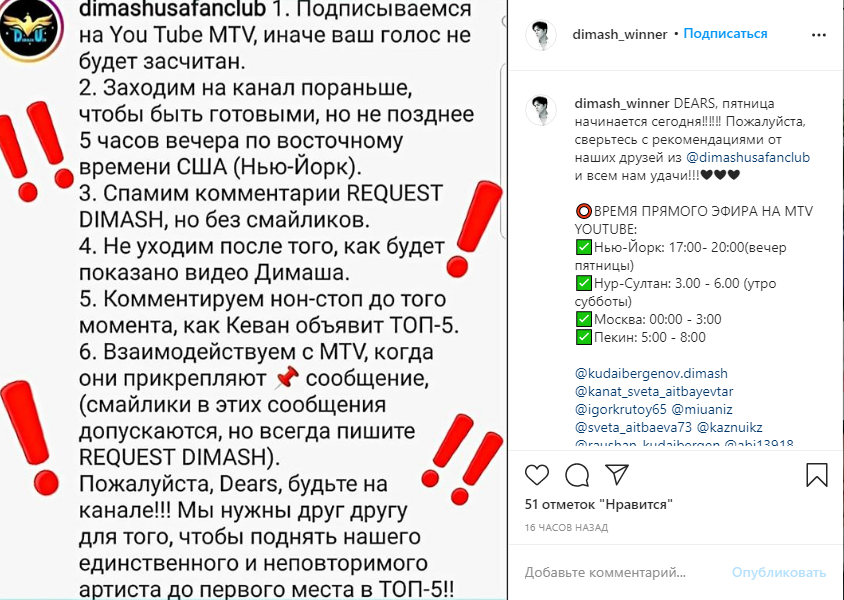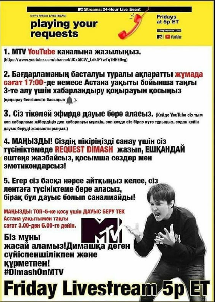 Как оказалось, поклонники творчества нашего соотечественника расписали целую инструкцию, как необходимо правильно голосовать за Димаша, чтобы его показывали в эфире MTV. Мы приведем вам некоторые примеры и алгоритм действий от фанатов Кудайбергена.
