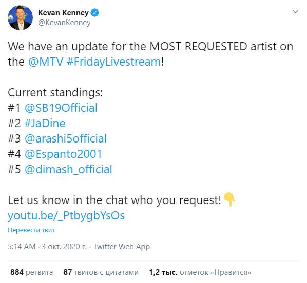 По словам отца исполнителя, Димаш оказался в пятерке самых востребованных певцов вечера по итогам голосования. "Мы рады сообщить: в эту пятницу, 9 октября, на официальном канале MTV YouTube Димаш будет добавлен в вещание в прямом эфире!" — написал он. Канат поздравил певца с успехом, а также поблагодарил поклонников Димаша.