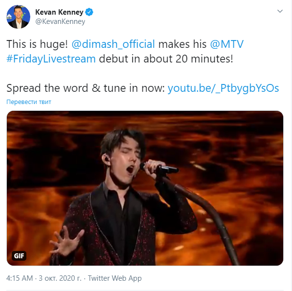 Девятого октября в казахстанском шоу-бизнесе состоялось очередное громкое событие. Всемирно известного казахстанского певца Димаша Кудайбергена в очередной раз показали в эфире популярнейшего музыкального канала MTV USA. Первым эту радостную новость сообщил отец и продюсер исполнителя Канат Айтбаев.