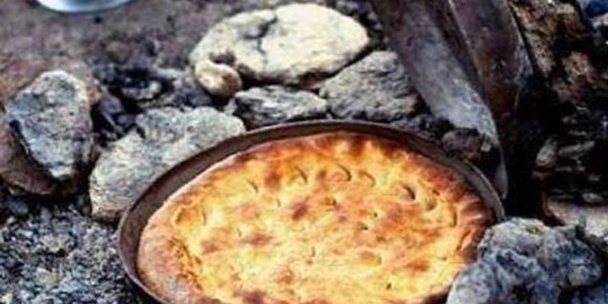 А потом казан просто переворачиваем над углями, оставляем на кострище, и наш хлеб так печется. Минут 25 достаточно, достаем казан из углей, аккуратно поддеваем за край хлеб, кладем его в миску. Можно сразу порезать на куски, так как он необычной конусной формы. Можно смазать маслом и подать горячим к чаю. Восторгу домашних предела не будет.