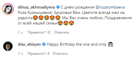 Люди в комментариях поздравили Розу Рымбаеву, в их числе певица Дильназ Ахмадиева и певец Диас Аблаев: