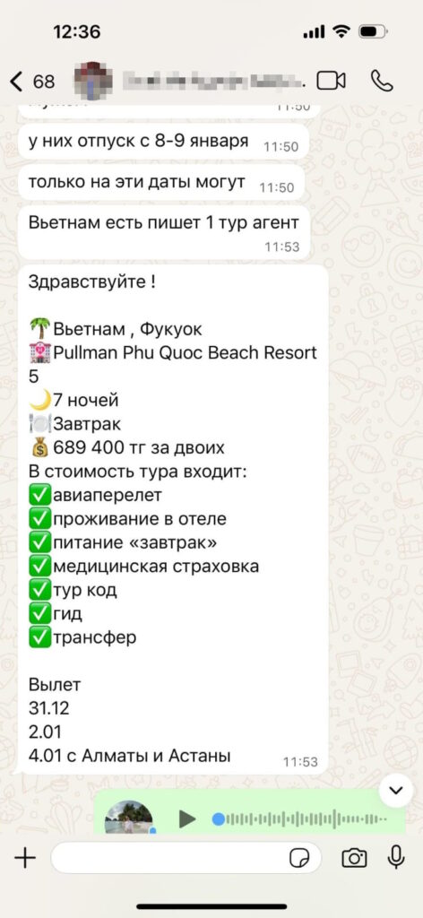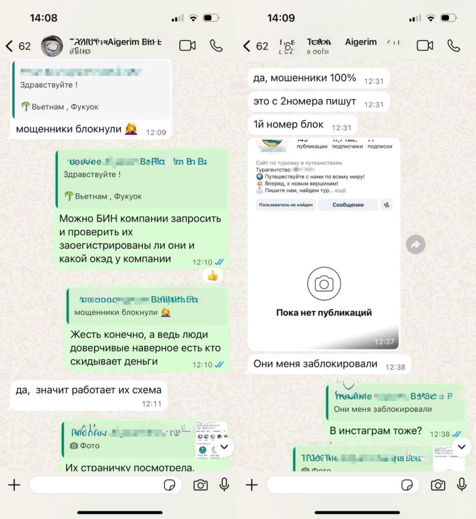 «Добрый день! Сегодня ко мне обратилась девушка с просьбой проверить достоверность очень привлекательной цены за тур по направлению Фукуок. Я ей написала, чтобы она запросила ТО и авиаперевозчика, она так и сделала. Сначала те ей ответили, что якобы «ТО Anex», далее написали, что это отказной тур. После она запросила БИН компании. Они скинули очень похожую на реальность справку о госрегистрации. Я проверила этот БИН на сайте salyk.kz, такая компания с таким БИН не зарегистрирована. В общем, они после запроса и проверки всех данных заблокировали ее в WhatsApp и в Instagram.