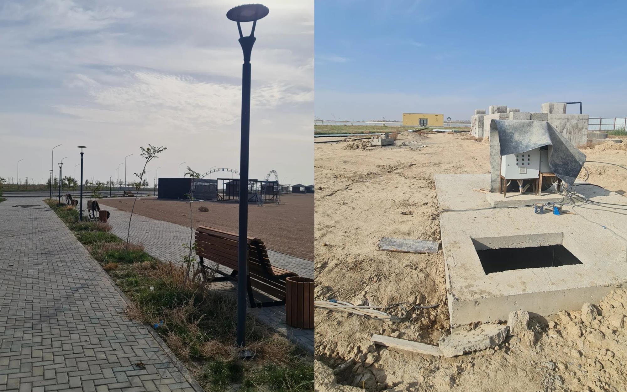 Разрушенное и недостроенное состояние инфраструктуры видно на фото. В конце пляжа даже брусчатку не доложили, не говоря уже о лавочках, столбах освещения (которые без лампочек) и деревьях.