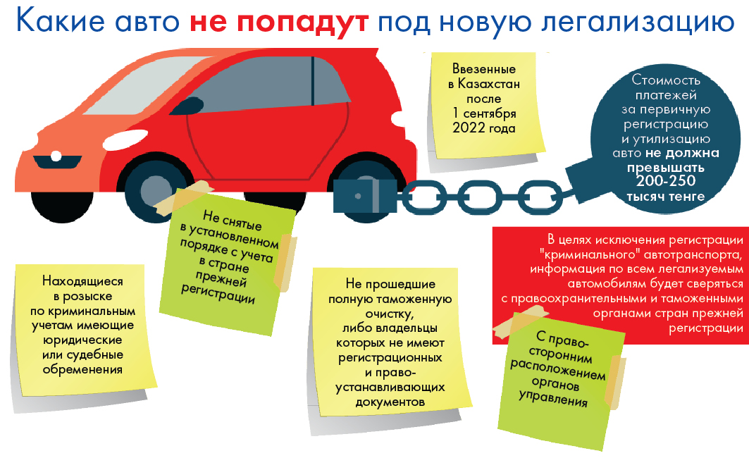 В МВД сообщили, что сейчас формируются поправки в законодательные акты, позволяющие гражданам провести легализацию ввезенных иностранных автомобилей на приемлемых для них условиях. Уже проработаны вопросы обмена информацией между МВД, КГД и Погранслужбой КНБ. Сведения по таким автомобилям обобщаются для исключения легализации авто, ввезенных после установленного срока.