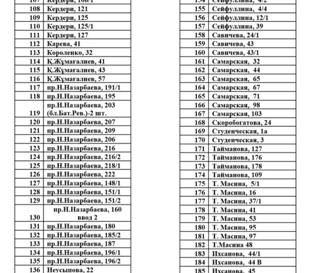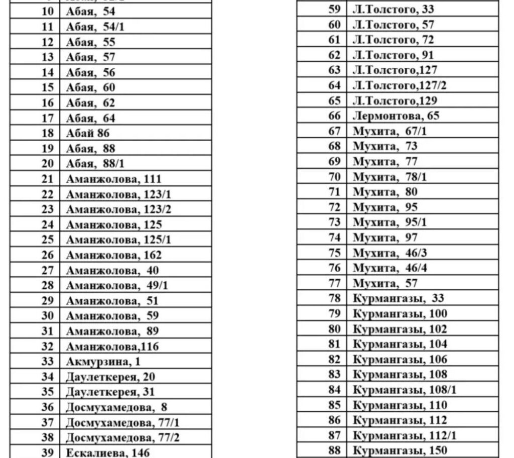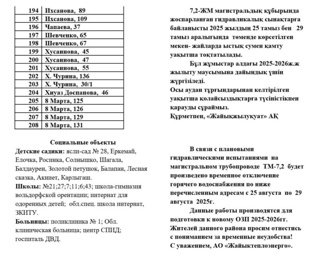 С 25 по 29 августа 2025 года горячее водоснабжение будет временно отключено по указанным адресам в центральной части Уральска. Под отключение подпадут некоторые детсады, школы и медицинские учреждения.