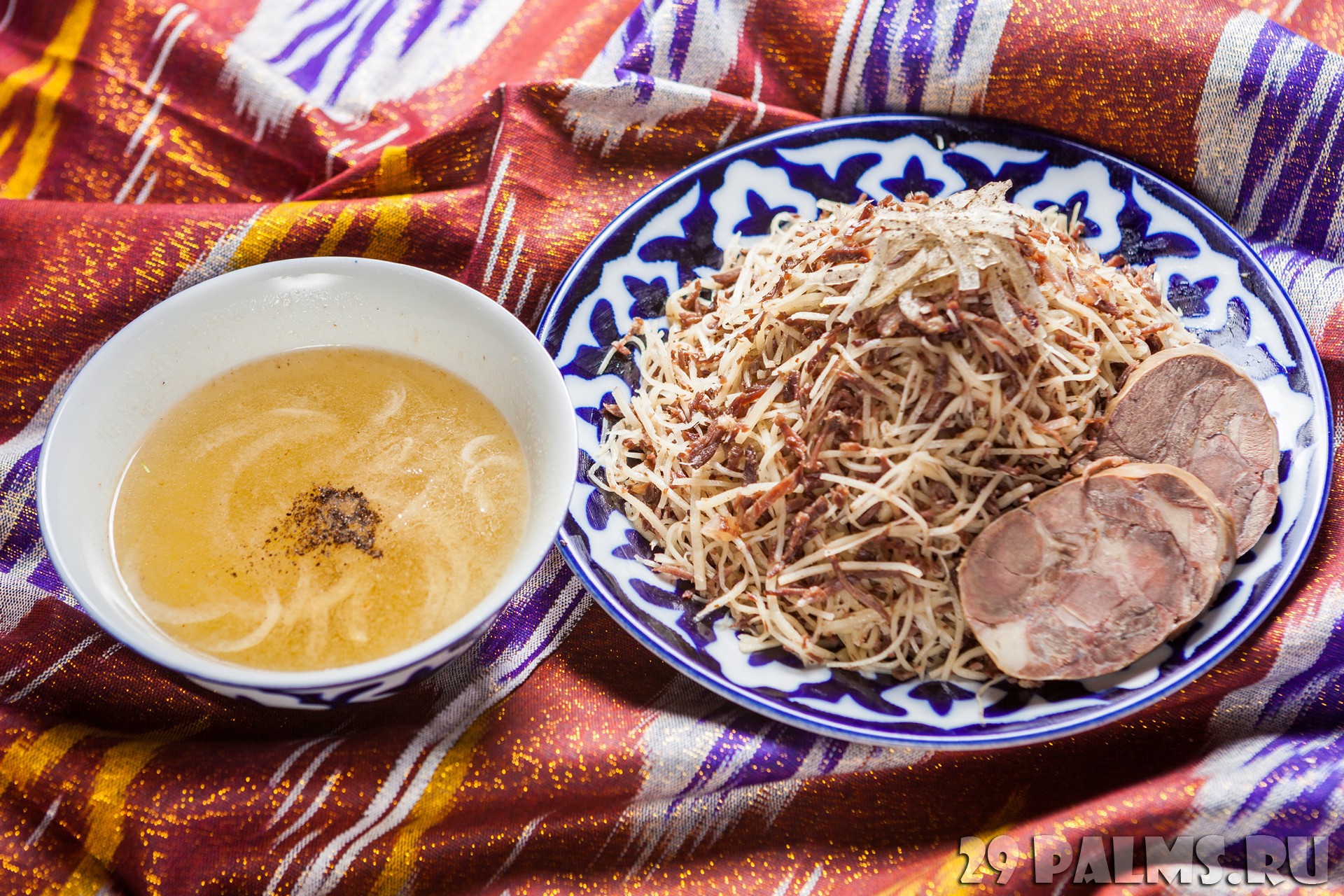 Только потом тесто нужно нарезать тонкой соломкой, крупной соломкой нужно порезать и вареное мясо. Приправить все зирой и перцем, добавить немного прокаленного подсолнечного масла и перемешать. Подавать с горячим бульоном».