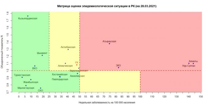 Согласно им 28 марта, в "красной" зоне остаются четыре региона, сообщает медиа-портал Caravan.kz.