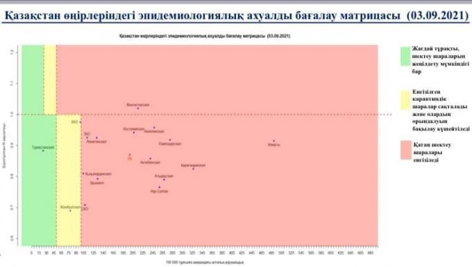 Cогласно матрице оценки эпидемиологической ситуации в регионах РК на 3 сентября 2021 года, в "красной" зоне: гг. Нур-Султан, Алматы, Шымкент, и Акмолинская, Актюбинская, Алматинская, Атырауская, Западно-Казахстанская, Карагандинская, Костанайская, Кызылординская, Мангистауская, Павлодарская, Северо-Казахстанская области.