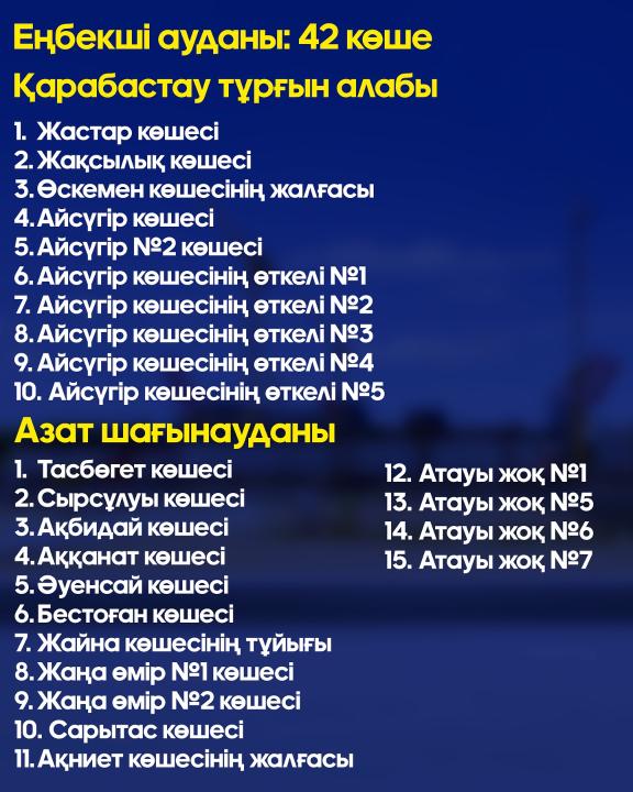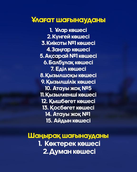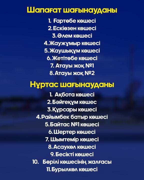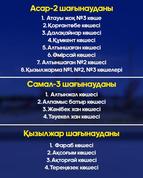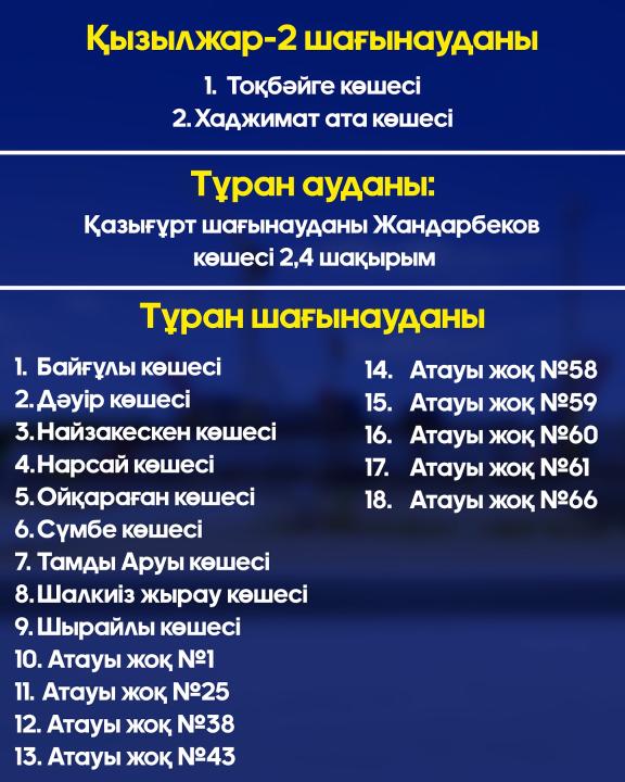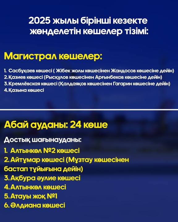 В числе магистральных улиц, подлежащих ремонту: Сасбұкаев (от улицы Жибек жолы до улицы Жандосова), Казиев (от улицы Рыскулова до улицы Аргынбекова), Кремлевская (от улицы Калдаякова до улицы Гагарина), а также улица Казына.