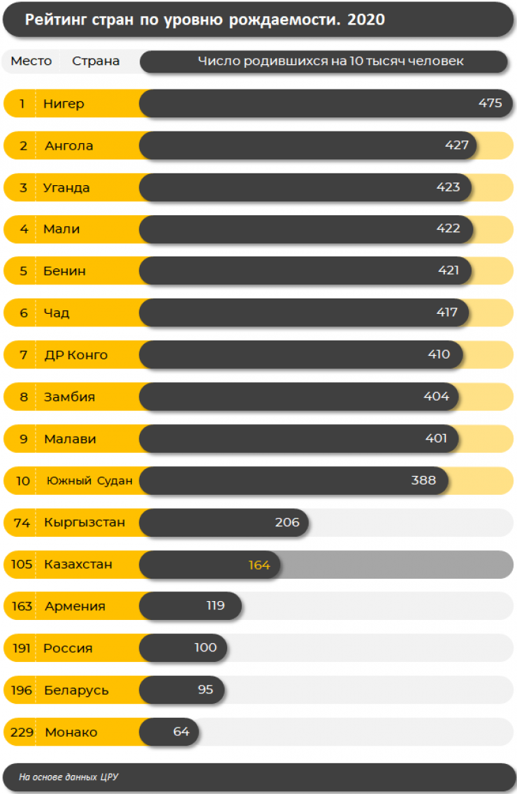 В рейтинге стран мира по уровню рождаемости, согласно данным ЦРУ, Казахстан занял 105-е место из 229. На 10 тысяч человек в Казахстане приходится в среднем 164 родившихся, передает Caravan.kz со ссылкой на Finprom.kz.