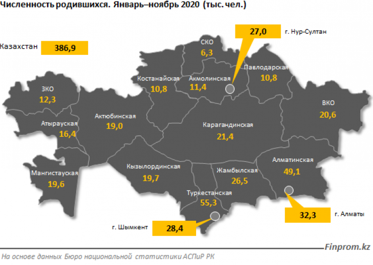 За январь-ноябрь 2020 года в Казахстане родились 386,9 тысячи человек, это на 5 процентов больше, чем годом ранее.