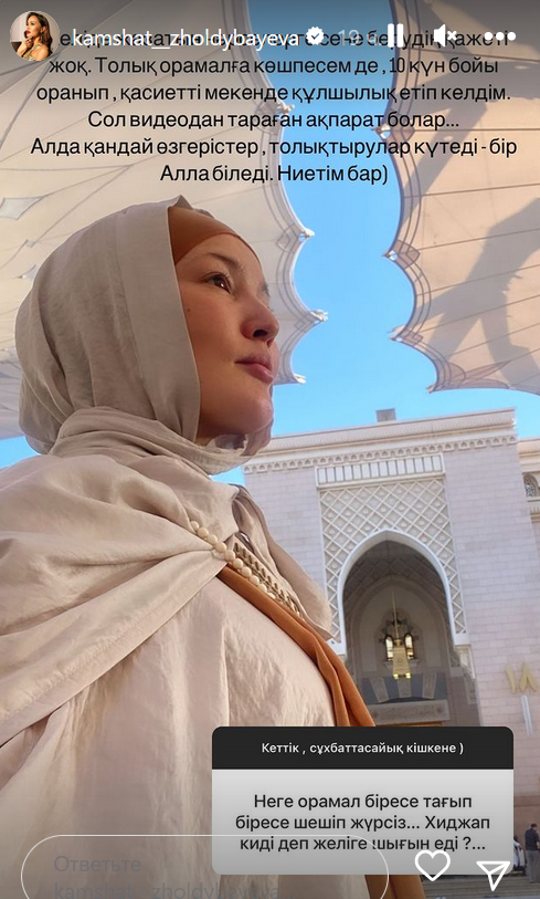 "Не стоит верить всему, что пишут в интернете. Хотя и не ношу платок все время, в течение 10 дней я носила его во время паломничества к святым местам. Возможно, видео распространилось из-за снятого тогда видео. Только Аллах знает, какие меня впереди ждут изменения. Мысли об этом есть", — ответила Камшат.