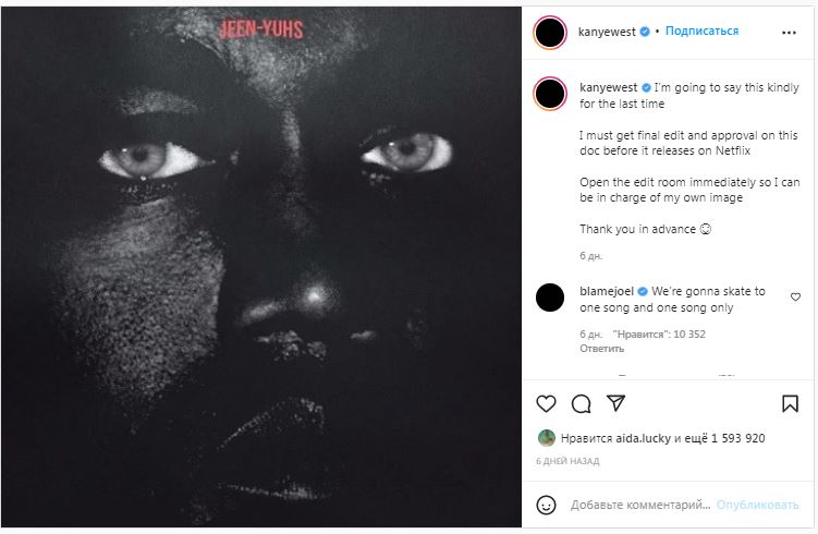 Канье выложил пост с обложкой трехсерийного биографического фильма о нем под названием Jeen-Yuhs (созвучно с genius, с англ. «гений») с «доброй просьбой» о предоставлении ему прав на монтаж, пишет Glamour.ru