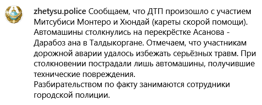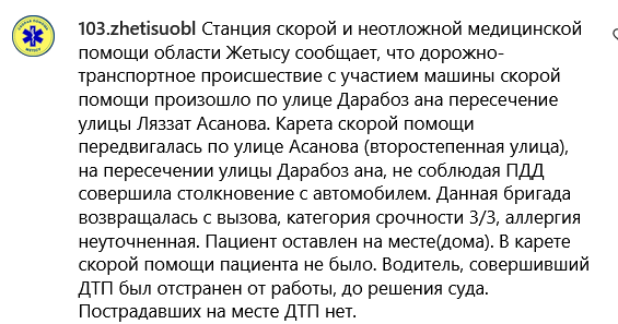 "Дорожно-транспортное происшествие с участием машины скорой помощи произошло по улице Дарабоз ана, пересечение с улицей Ляззат Асановой. Карета скорой помощи передвигалась по улице Асановой (второстепенная улица) и на пересечении с улицей Дарабоз ана, не соблюдая ПДД, совершила столкновение с автомобилем. Данная бригада возвращалась с вызова, категория срочности 3/3, аллергия неуточненная. Пациент оставлен на месте (дома). В карете скорой помощи пациента не было. Водитель, совершивший ДТП, был отстранен от работы до решения суда. Пострадавших на месте ДТП нет", — говорится в сообщении.