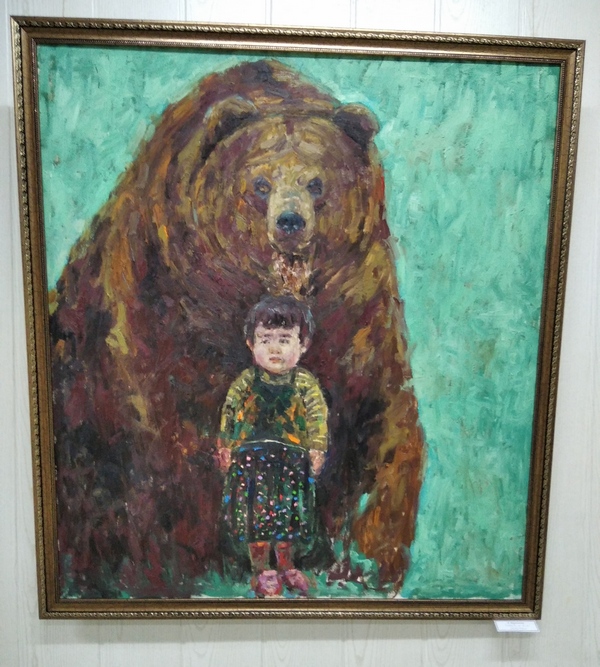 На картинах Асель ее дочка всегда выглядит маленькой и беззащитной девочкой. Особенно это заметно в работе “Тотем”, где позади Медины изображен свирепый бурый медведь.