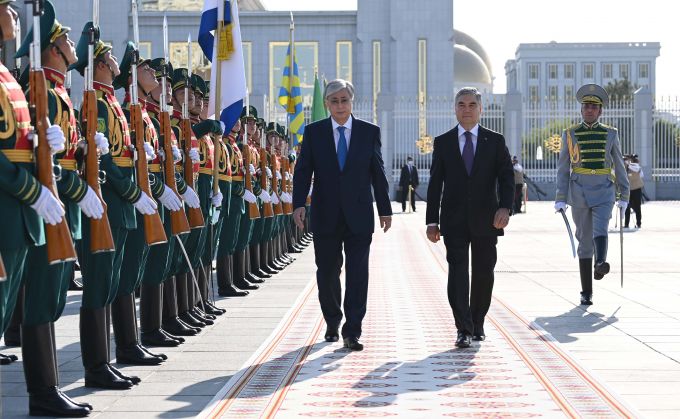Начальник почетного караула отдал рапорт лидерам двух стран, были исполнены государственные гимны Казахстана и Туркменистана. Затем Касым-Жомарт Токаев и Гурбангулы Бердымухамедов обошли строй почетного караула и представили друг другу членов официальных делегаций, сообщает официальный сайт Акорды.