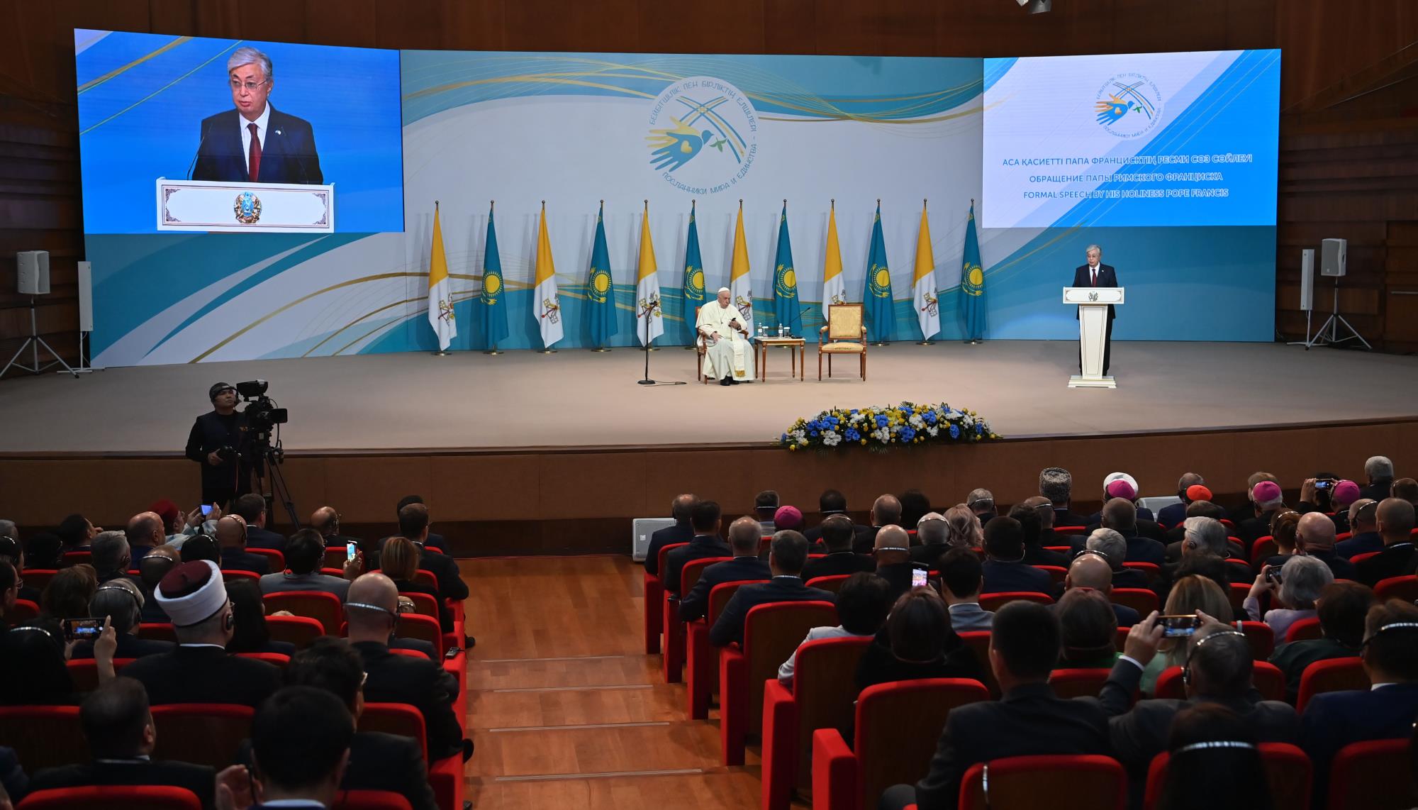 Затем к участникам мероприятия обратился Папа Римский Франциск. В своей речи он высказал удовлетворение своим апостольским визитом на древнюю казахскую землю. Как сказал Понтифик, он прибыл сюда в качестве паломника мира с целью поиска диалога и единства.